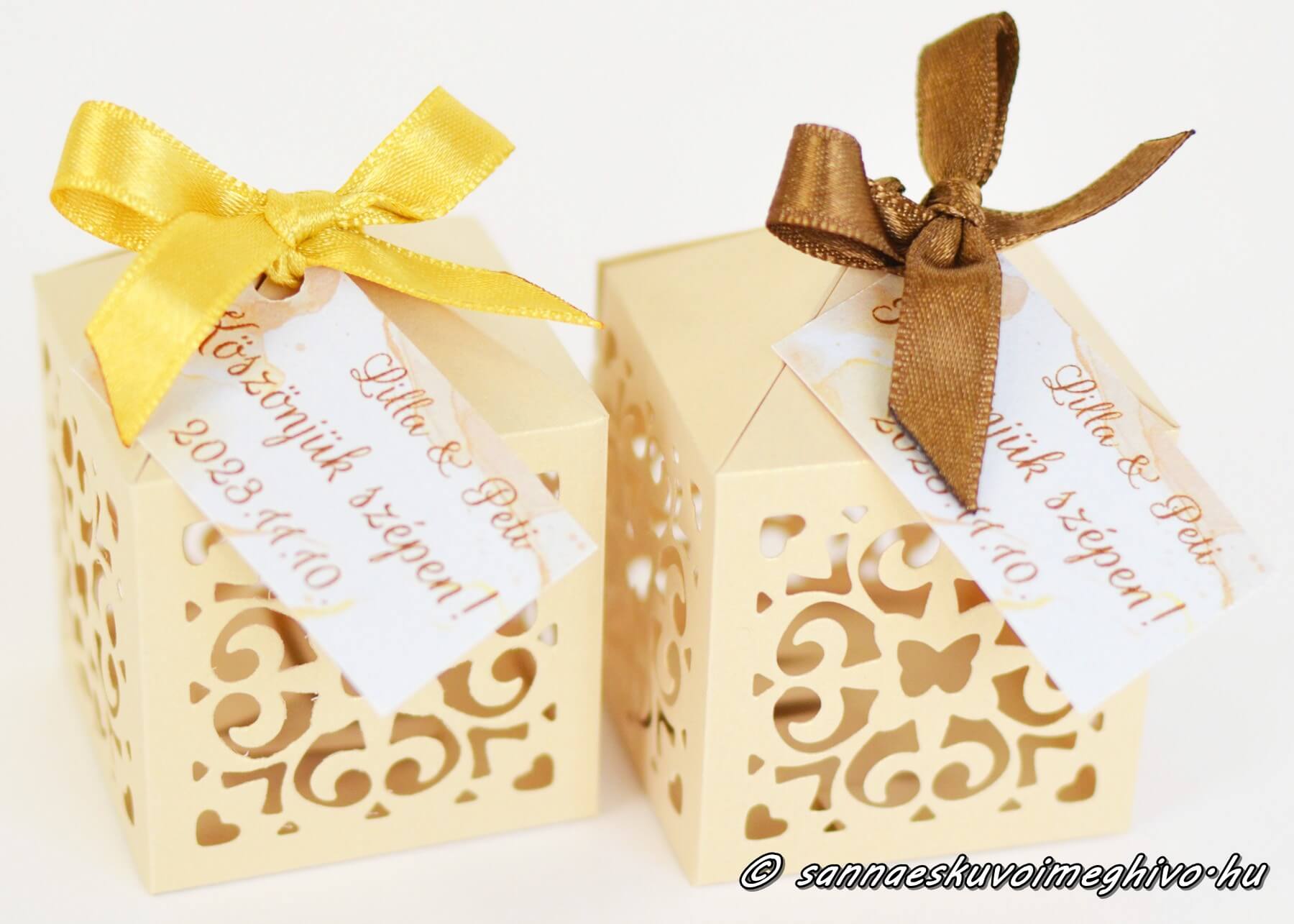 Egy esküvő minden apró részlete mesél. Ha szeretnéd, hogy a vendégeid egy kis emléket is magukkal vihessenek, a dobozos köszönetajándék üzenettel tökéletes választás! Ez a finom, csipkeszerű áttört mintával díszített dobozka több mint egy kiegészítő az asztalon. Titokzatosságot is rejt magában – hiszen a benne lapuló finomságokat csak akkor fedezhetik fel a vendégeid, amikor kibontják.