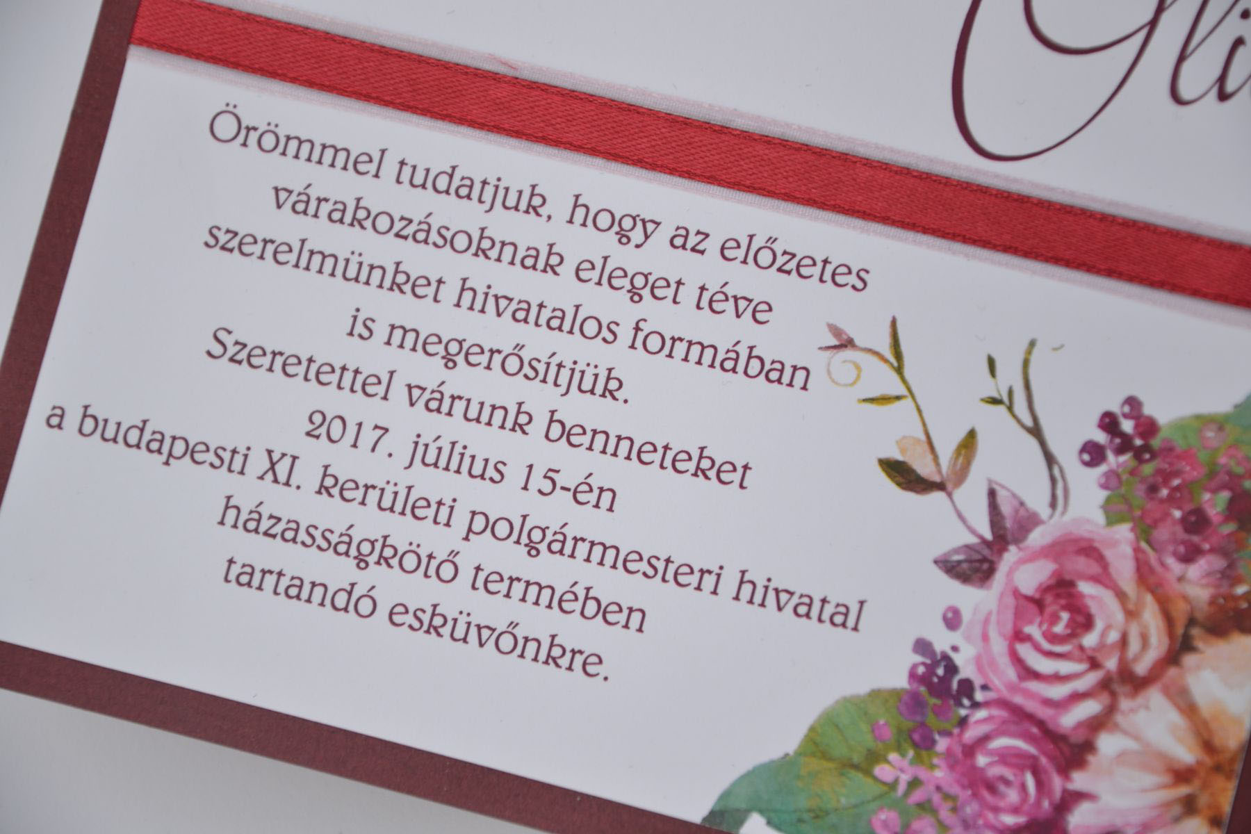 A meghívó két papírból készült. A hátsó papír egy vörös karton. Erre ragasztottuk a virágokkal, rózsákkal díszített fehér lapot. Vörös tintával nyomtattuk a meghívó szövegét. Díszítésül organza és szatén szalagot álmodtunk meg.