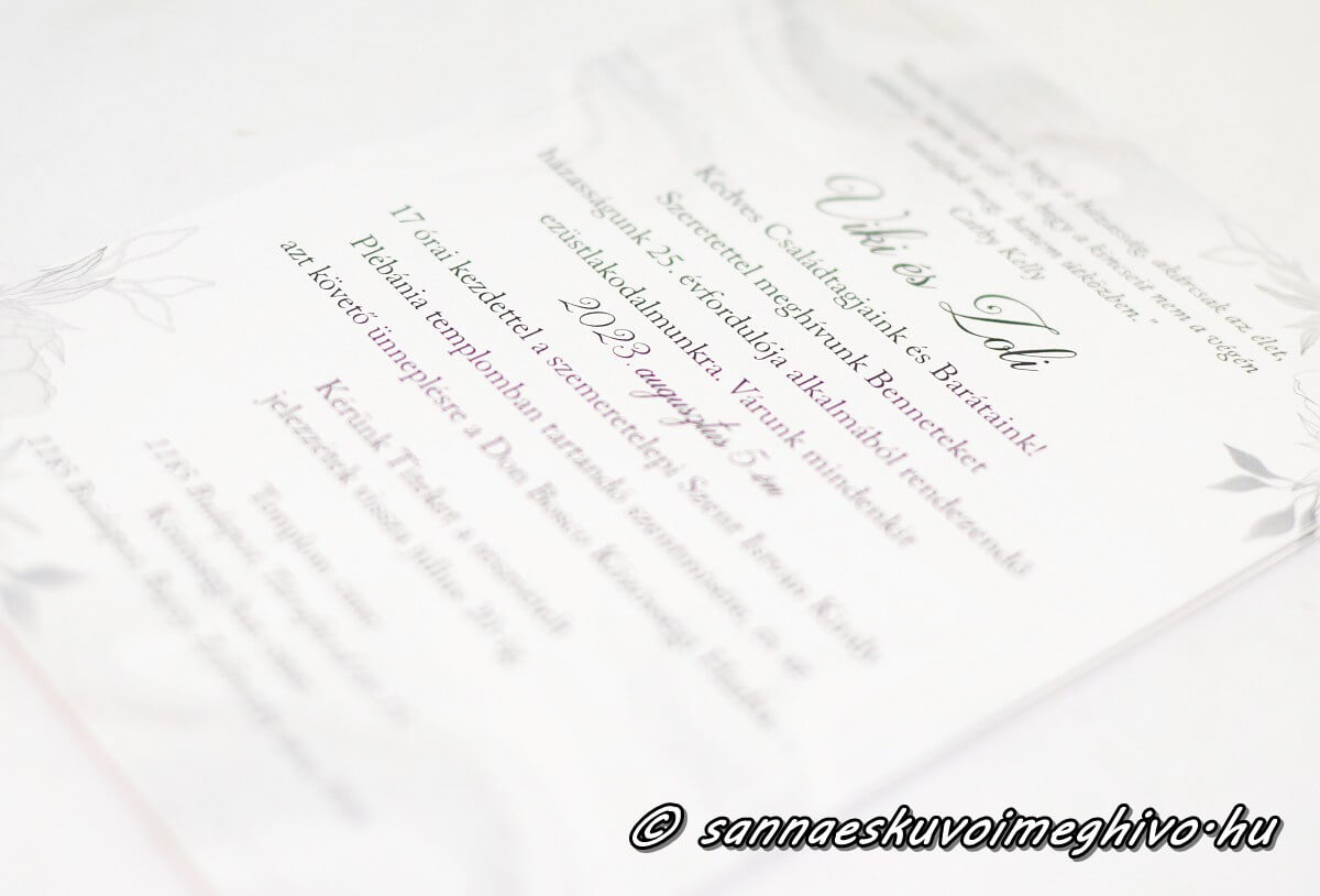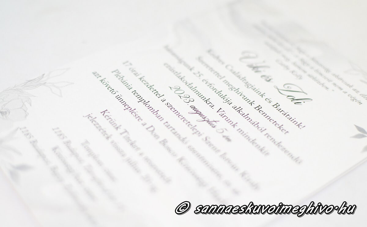 Ez a meghívó nem hivalkodó, de minden sorával, minden levelével azt sugallja: ez egy különleges nap. A különleges tipográfia és a jól elrendezett szöveg gondoskodik róla, hogy minden információ világos és átlátható legyen.
