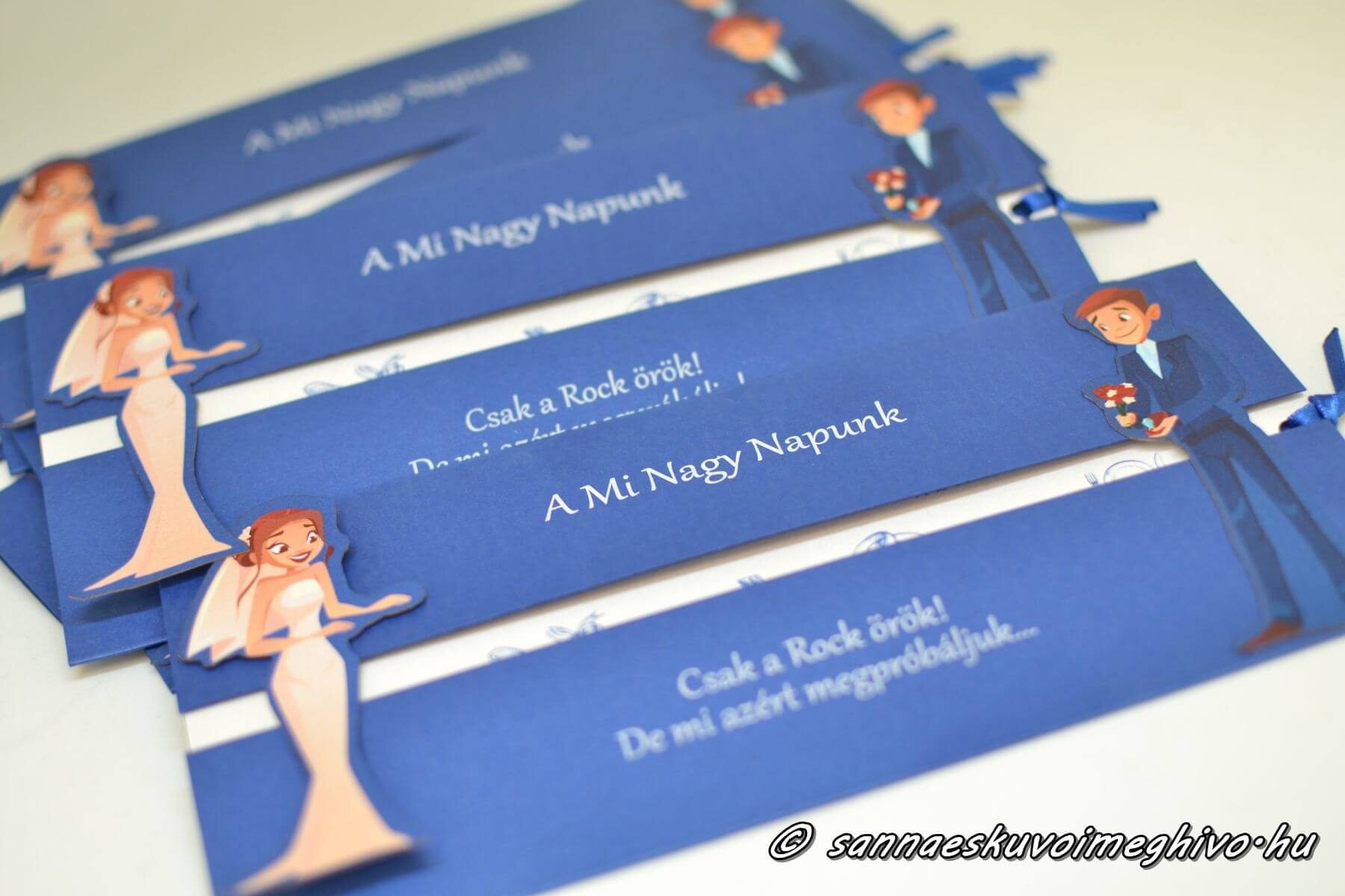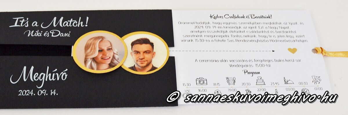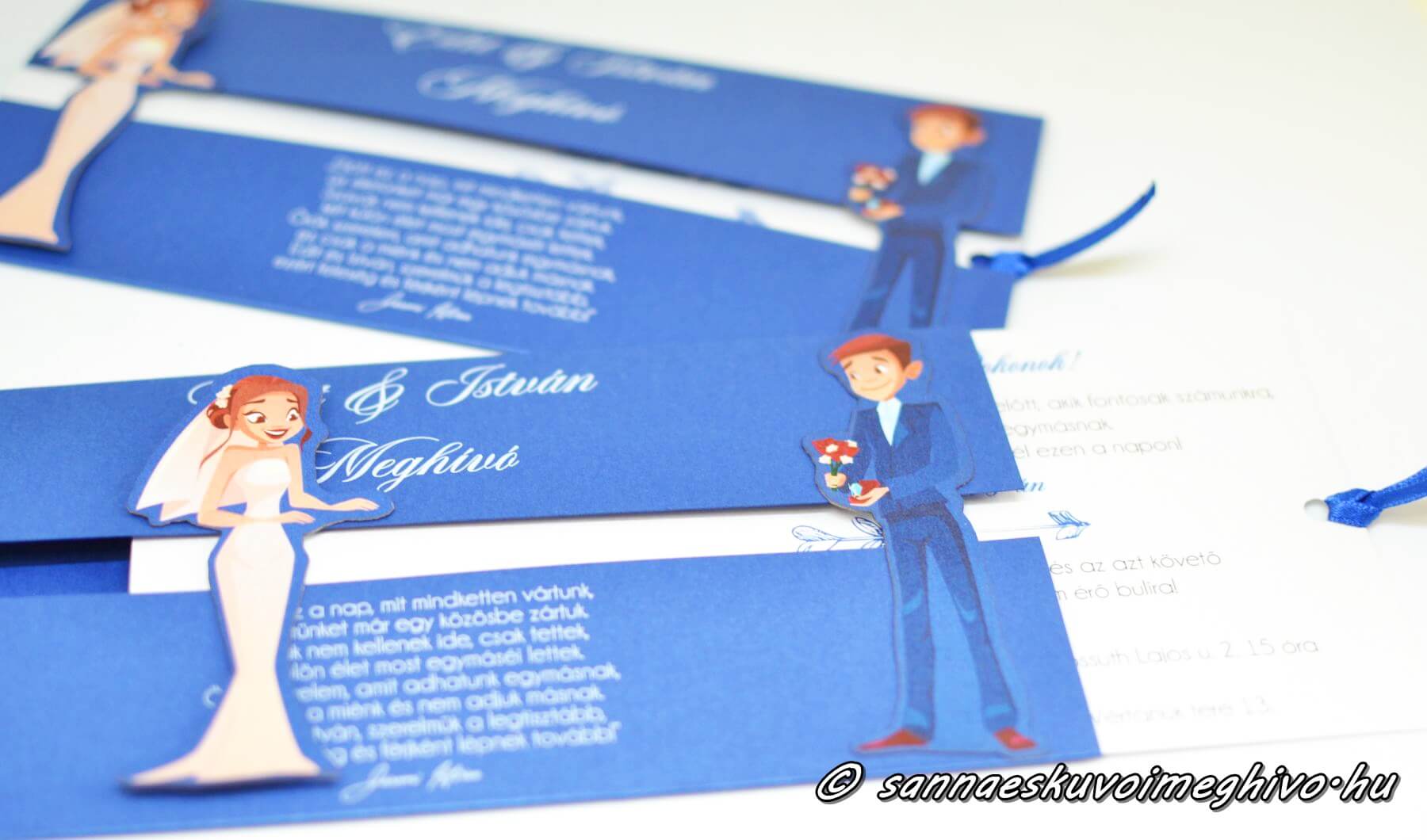 Az első oldalon a nevetek mellett egy kedves menyasszony-vőlegény rajz kap helyet, amelyhez ha szeretnéd egy idézet is társulhat. A meghívó különleges kialakításának köszönhetően egy finom mozdulattal – szatén szalagot – meghúzva bújik elő a tokjából, és válik olvashatóvá. A menyasszony és a vőlegény – szó szerint – közeledik egymáshoz, mintha egy kis mágneses varázslat vinné őket az esküvő felé. Ez a meghívó nemcsak egy szép emlék, hanem egy kedves játék is, amelyet a vendégek újra és újra kézbe vesznek majd.