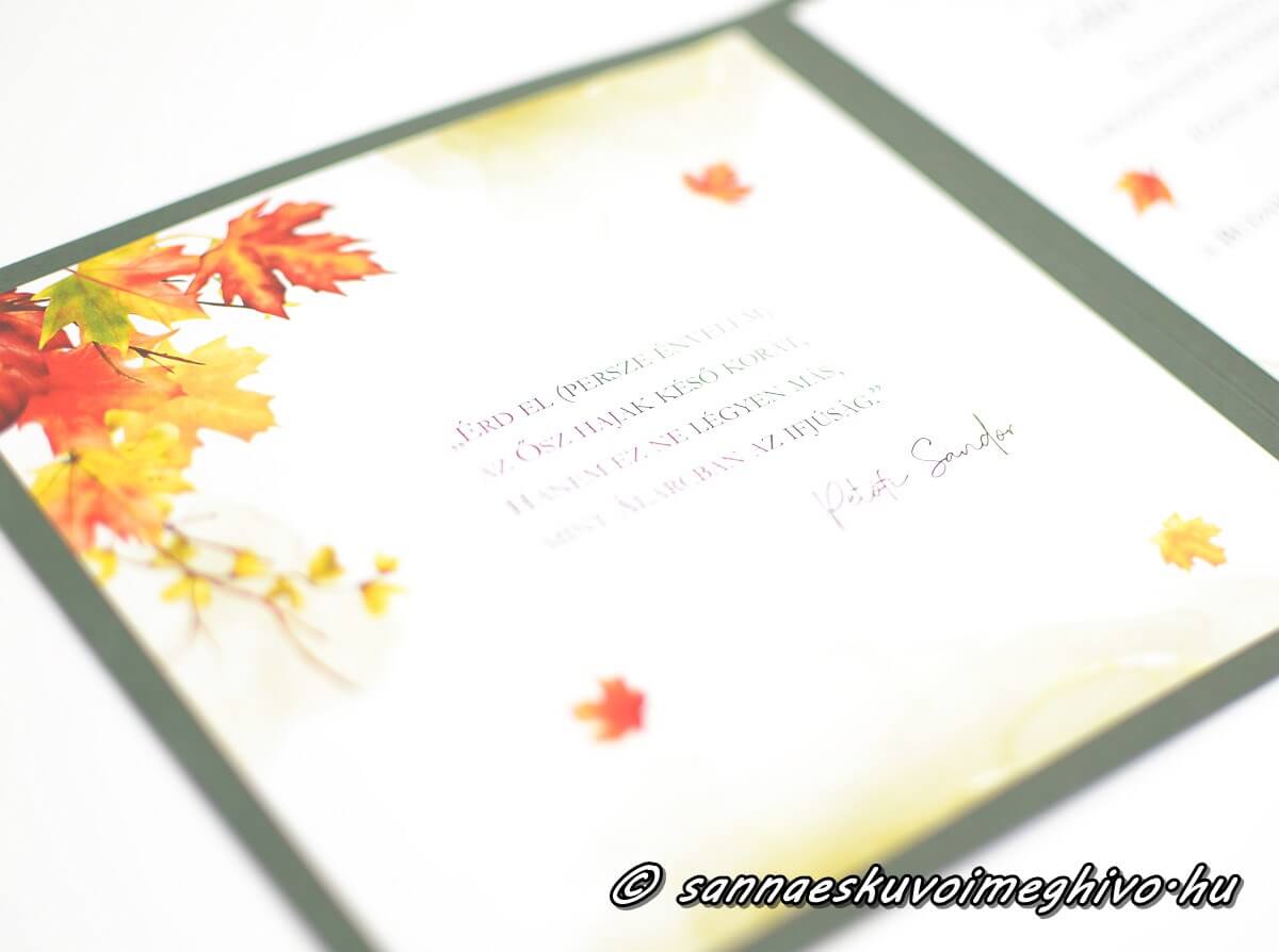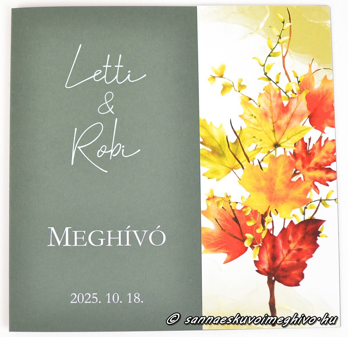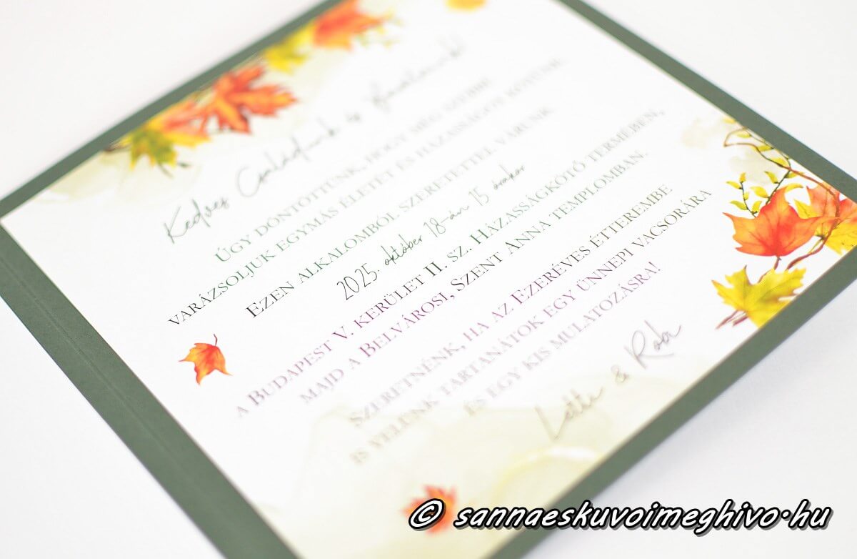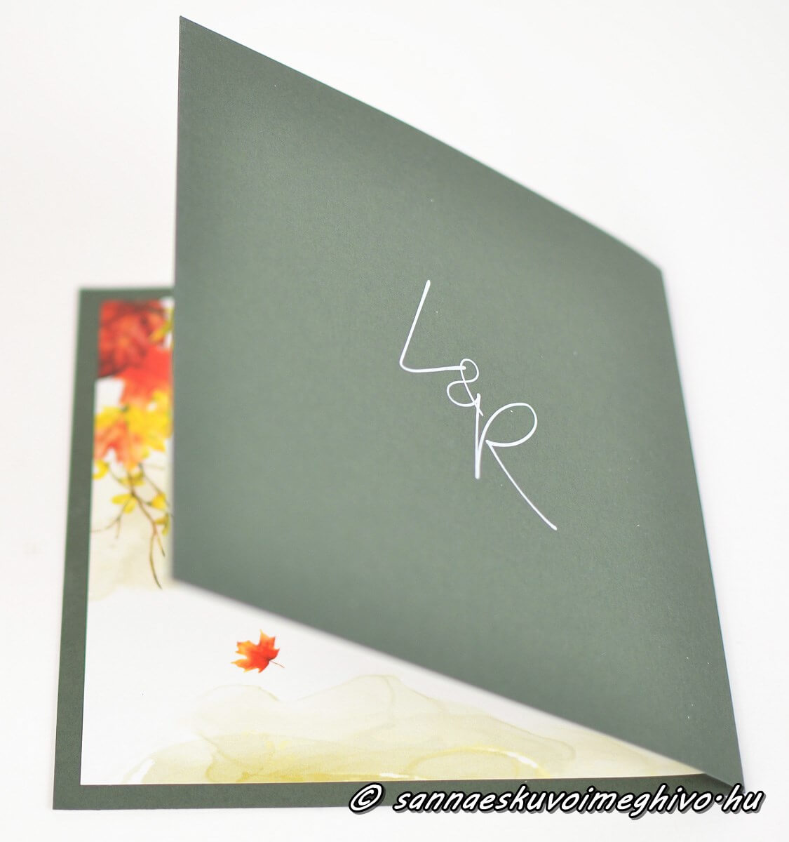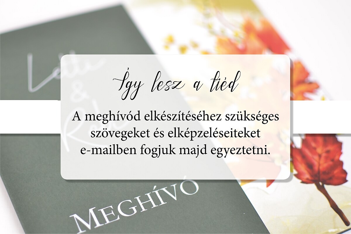 A meghívó alapját egy matt mohazöld karton adja, amely már kézbe véve is a természetet idézi. A karton finom textúrája és selymes tapintása kellemes, nyugtató érzetet kelt. A fehér háttéren megjelenő, könnyedén táncoló őszi levelek tovább fokozzák a meghívó természetes és varázslatos hangulatát.