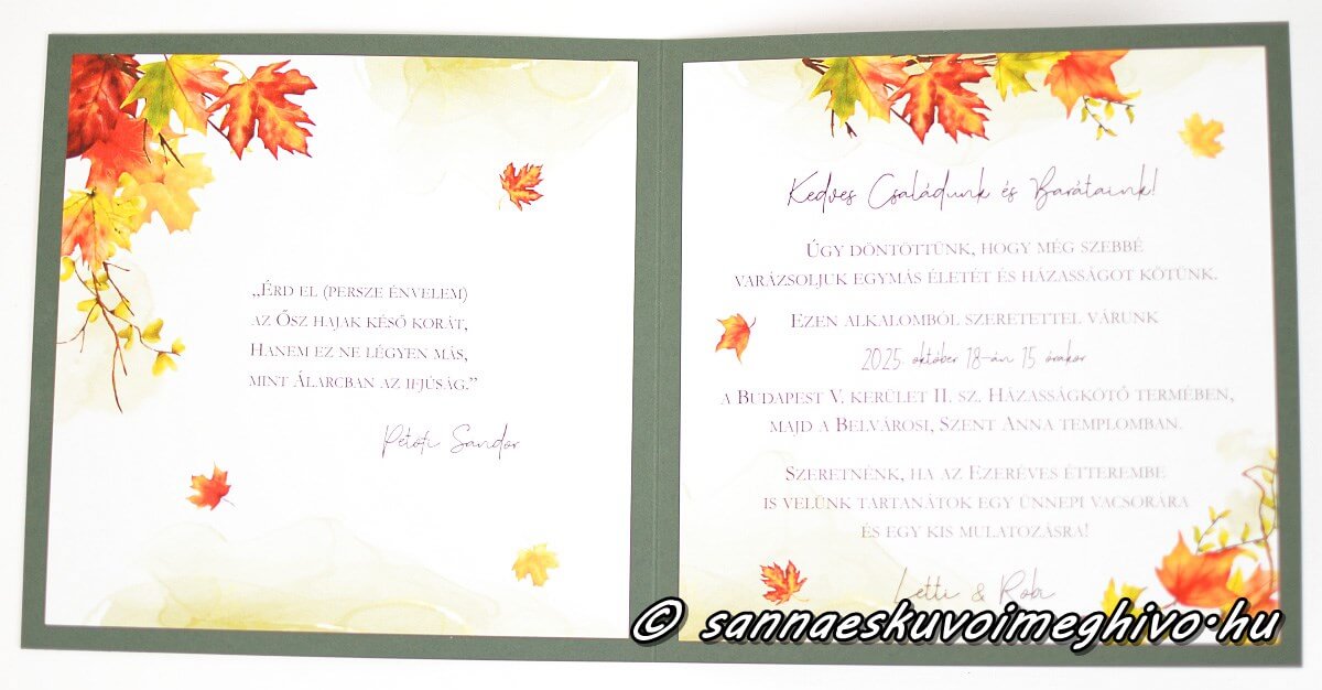 Kézbe venni ezt a meghívót olyan érzés, mintha egy darab őszt tartanál magadnál, tele a természet szépségével és az esküvőd varázslatával. Az apró részletek, a színek és a textúrák harmóniája már a meghívó első érintésénél meghittséget sugároz. Átadni pedig maga a természet és a romantika üzenete, amely egyszerre elegáns és szívhez szóló.
