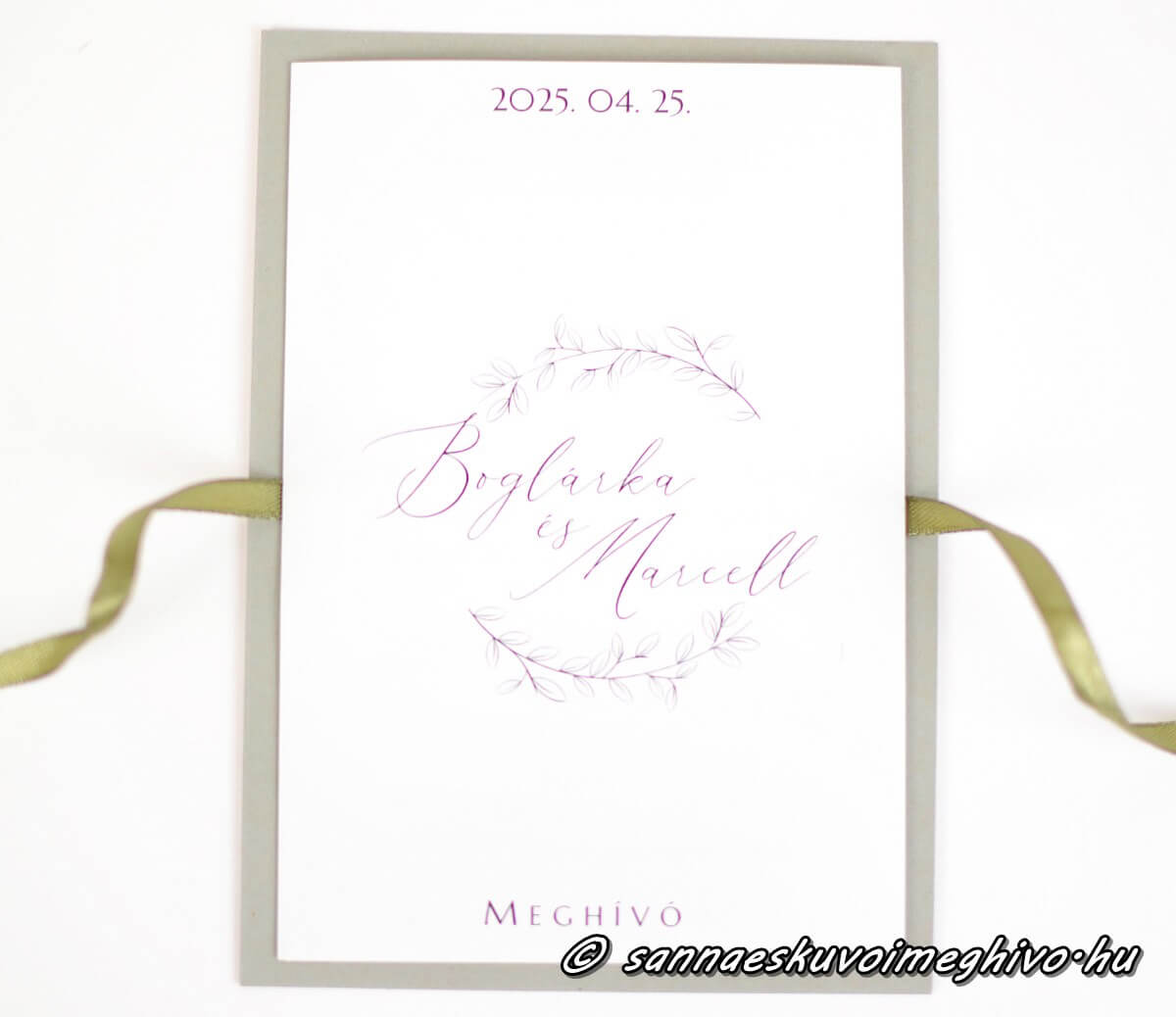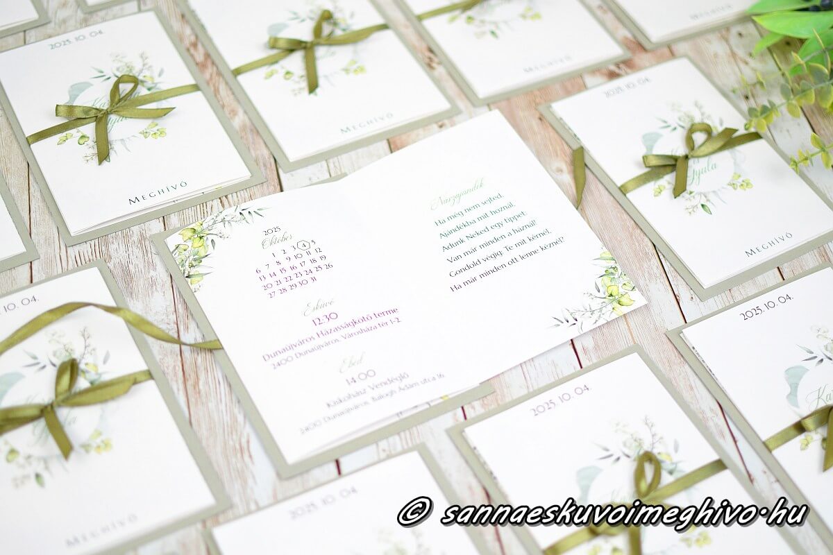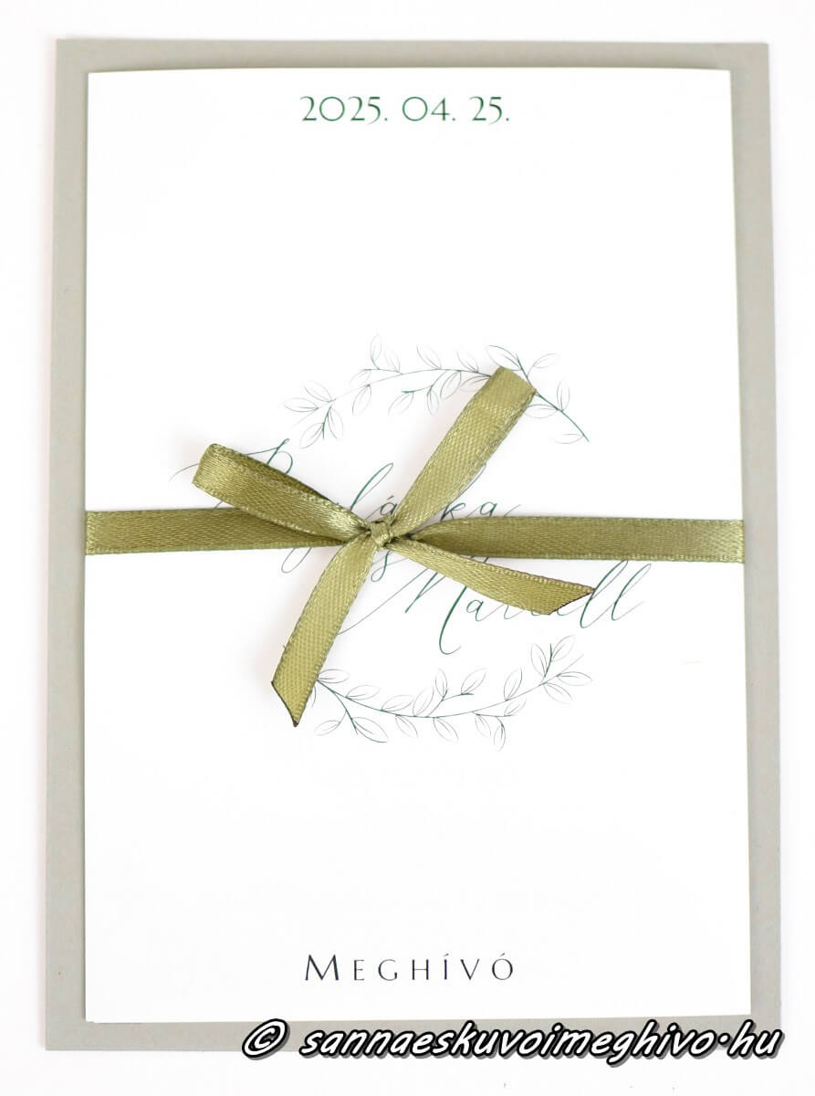 A meghívó alapját egy halványzöld, finom tapintású matt karton adja. Kézbe véve megnyugtató és ünnepi. Erre kerül a harmonikában hajtott hófehér papír, amely elegáns keretet ad a meghívásodnak. Az egészet egy szatén szalagból kötött masni köti össze, amely puha, mégis ünnepélyes érzetet kelt, mintha egy ajándékot adnál át.