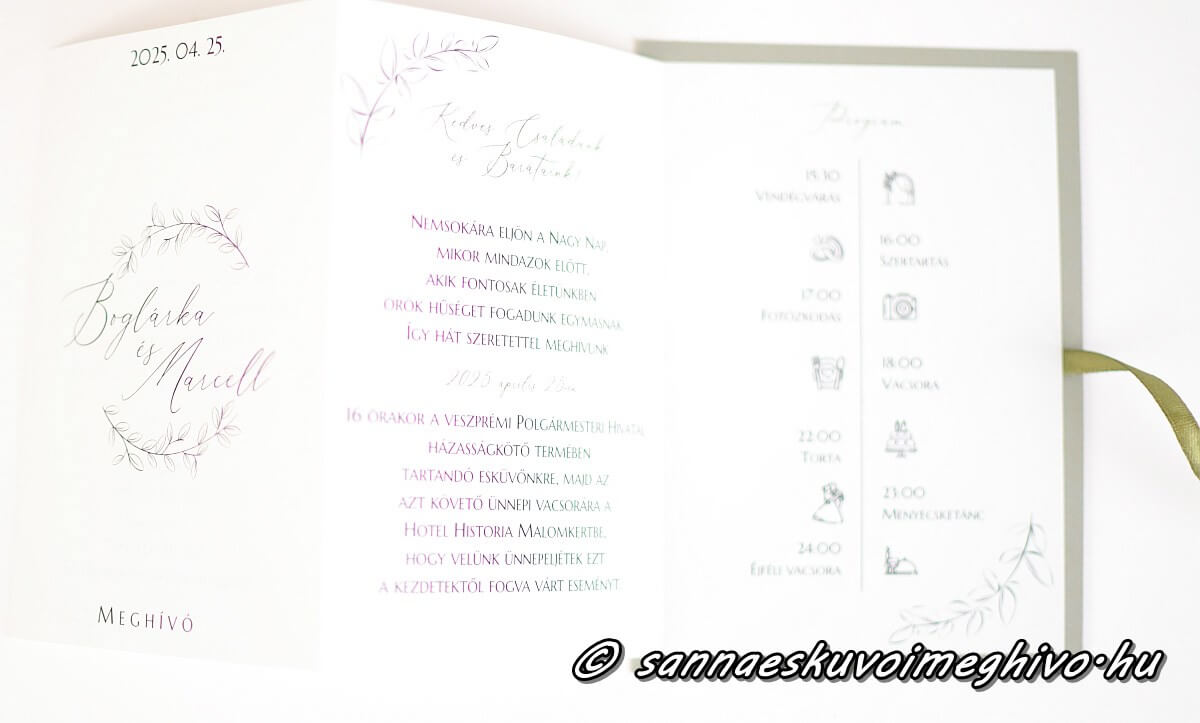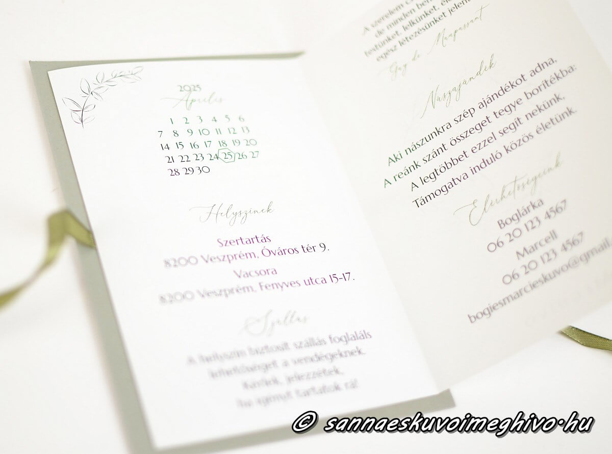 Az első oldalon a nevetek egy levélkoszorúval ölelve jelenik meg, amely egyszerre visszafogott és személyes. A masni kibontása után tárul fel a meghívód belső tartalma: az esküvőd szövege, a stílusos rajzokkal illusztrált idővonal, a legfontosabb címek és elérhetőségek, valamint a nászajándékkérő vers. Minden oldalon szolid levélminták futnak végig, finoman összekötve a meghívó elemeit.