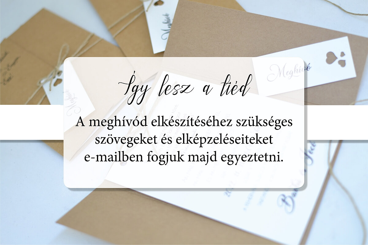 A rusztikus spárga magabiztosan öleli át a meghívót és őrzi a kivágott szív alakokkal díszített papírdarabot, melyen a Meghívó szöveg van. A masnit kioldva lehet kinyitni a meghívót. A két oldalról átölelő lapok úgy simulnak egymáshoz, mint egy nosztalgikus ölelés, amely magában hordozza a múlt meghittségét. Belül egy másik spárga rögzíti a fehér kartont a meghívód szövegével.