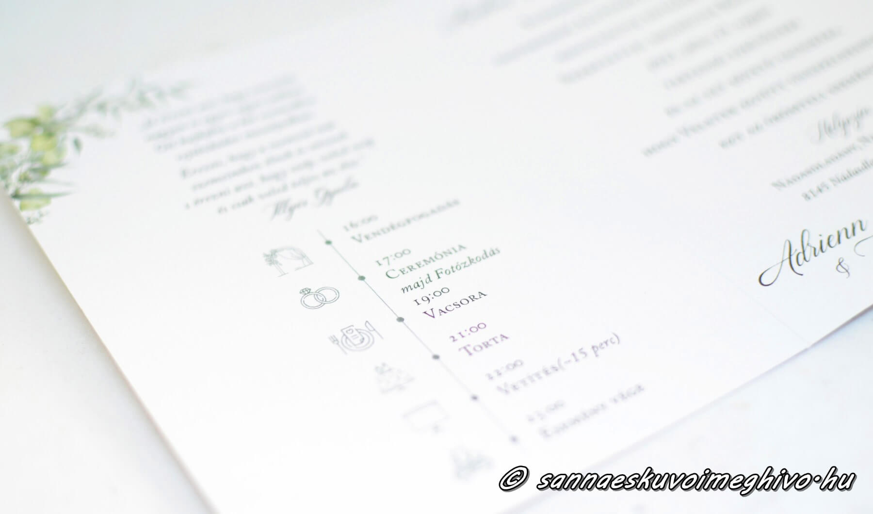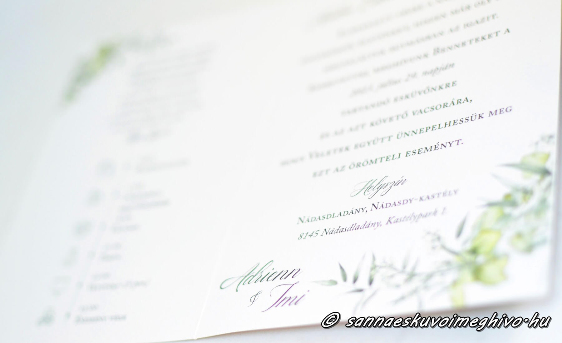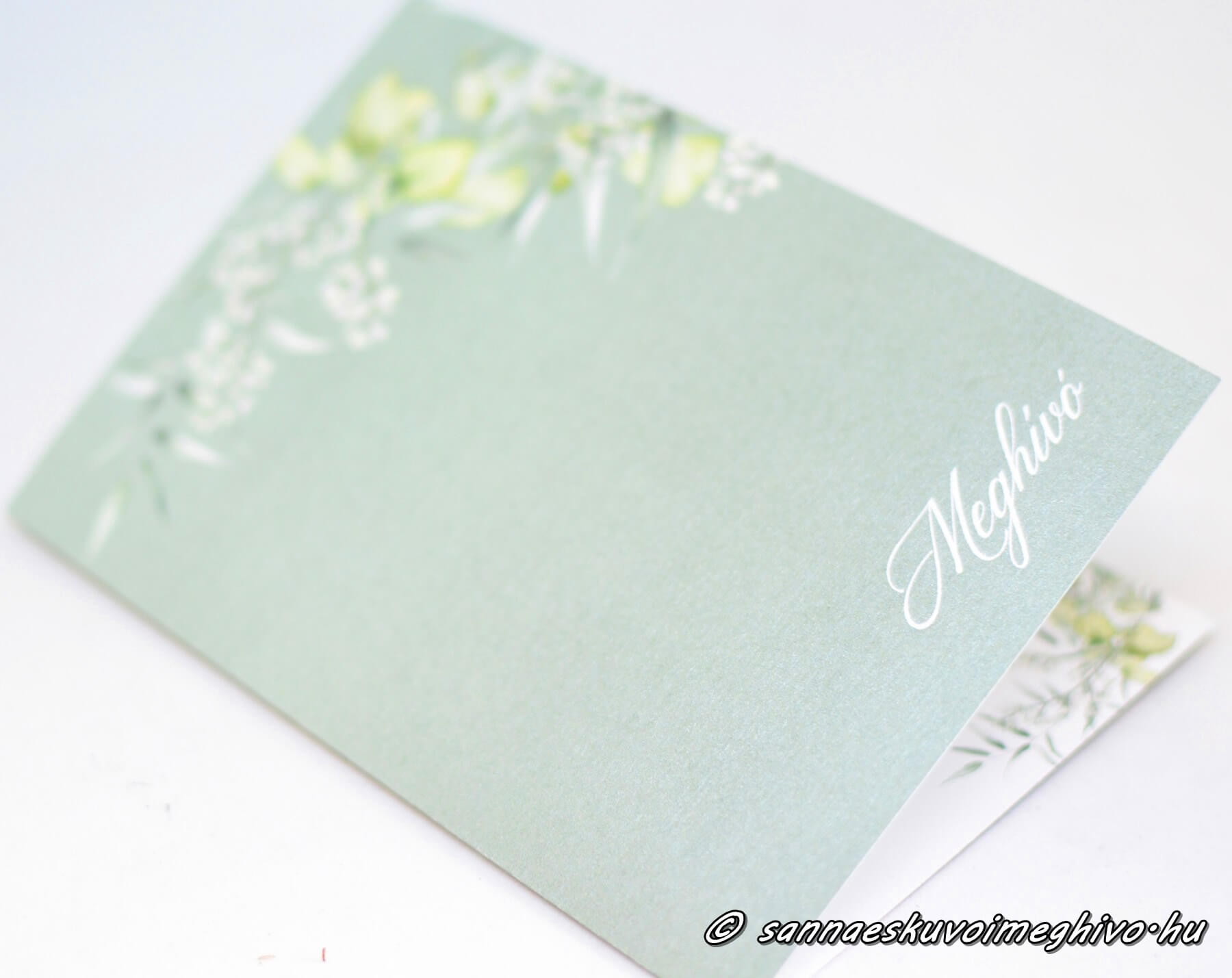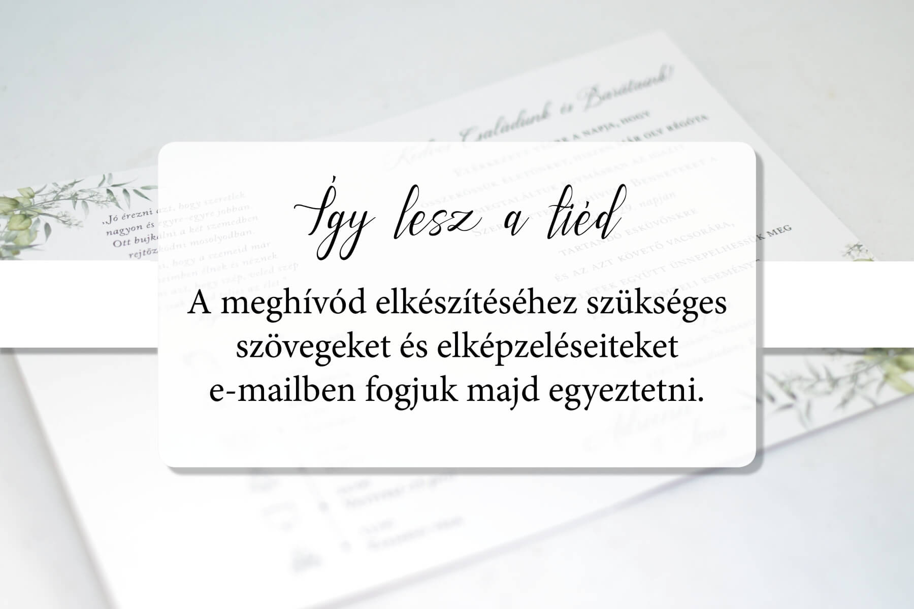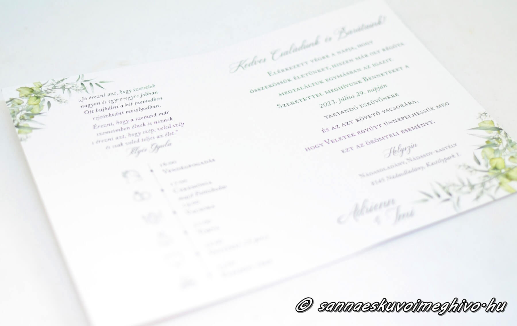 Az előoldalon a fehér betűk elegánsan simulnak a virágok közé, mintha egy könnyed szellő lehelt volna rájuk. Kinyitva a meghívót, egy gondosan szerkesztett belső tér tárul fel, ahol a nagy napotok részletei kapnak helyet. Az esküvőd programja, egy kedves idézet vagy akár egy nászajándék kérő vers teszi személyessé az üzenetet.