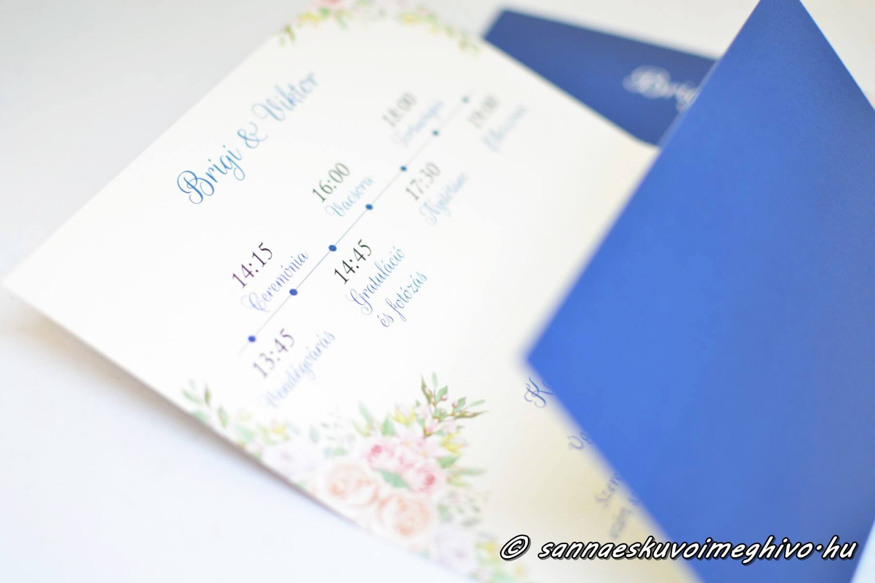 A meghívót kinyitva egy elegánsan három részre hajtott elrendezés tárul fel. Felül a nagy napotok programja kapott helyet, hogy a vendégek pontosan tudják, mire számíthatnak. Középen a meghívó szövege áll, amely meleg szavakkal hívja meg szeretteiteket erre a különleges alkalomra. Alul egy kedves nászajándékkérő versikével üzenhettek finoman arról, ha inkább praktikus ajándékra vágytok.