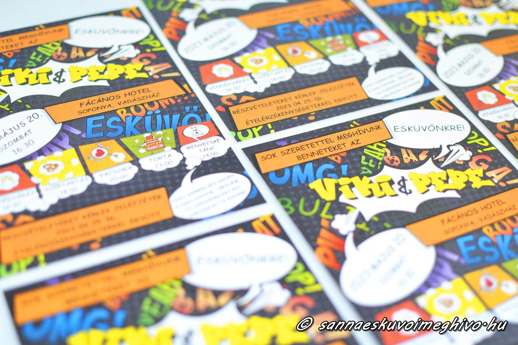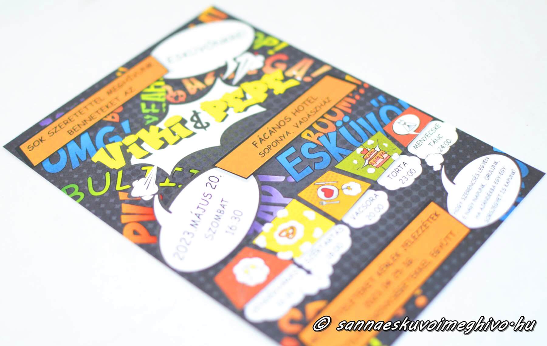 Ha szereted a különleges, személyes és humoros megoldásokat, a Képregény esküvői meghívó egy igazi igazi színkavalkád, ami garantáltan levesz a lábadról! Legyen az esküvőtök egy saját képregény, tele szerelemmel, vidámsággal és meglepetésekkel! Ez a meghívó nemcsak informál, hanem egy kis történetet is mesél rólatok, amit a vendégeitek örömmel fognak forgatni.