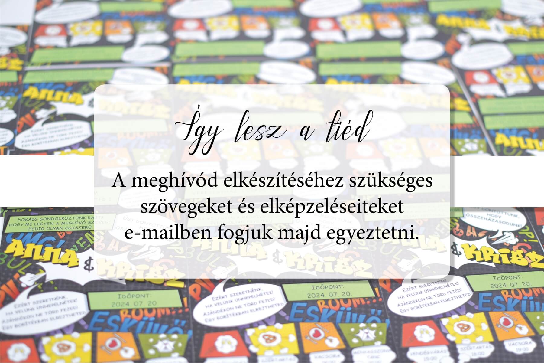 Átadni ezt a meghívót olyan érzés, mintha egy kis darabot adnál a saját történetedből. Megkapni pedig olyan, mintha egy különleges képregény egyetlen példányát tartanák a kezükben, amely kizárólag nekik készült.