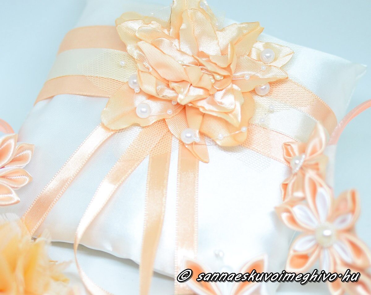 A hófehér szatén gyűrűpárnán három narancs színű szatén szalag feszül. A felső sarokba egy narancs színű szatén virágot tettem, melyet fehér gyöngysor díszít.