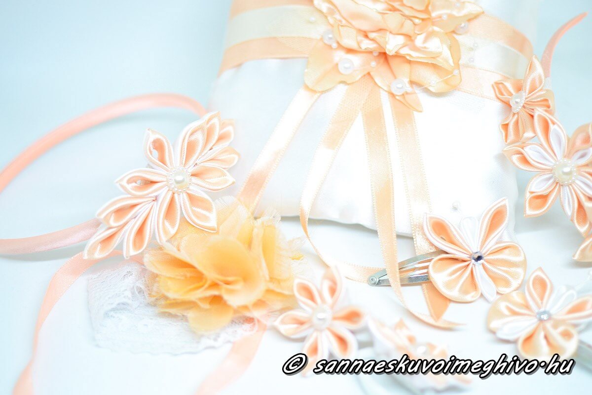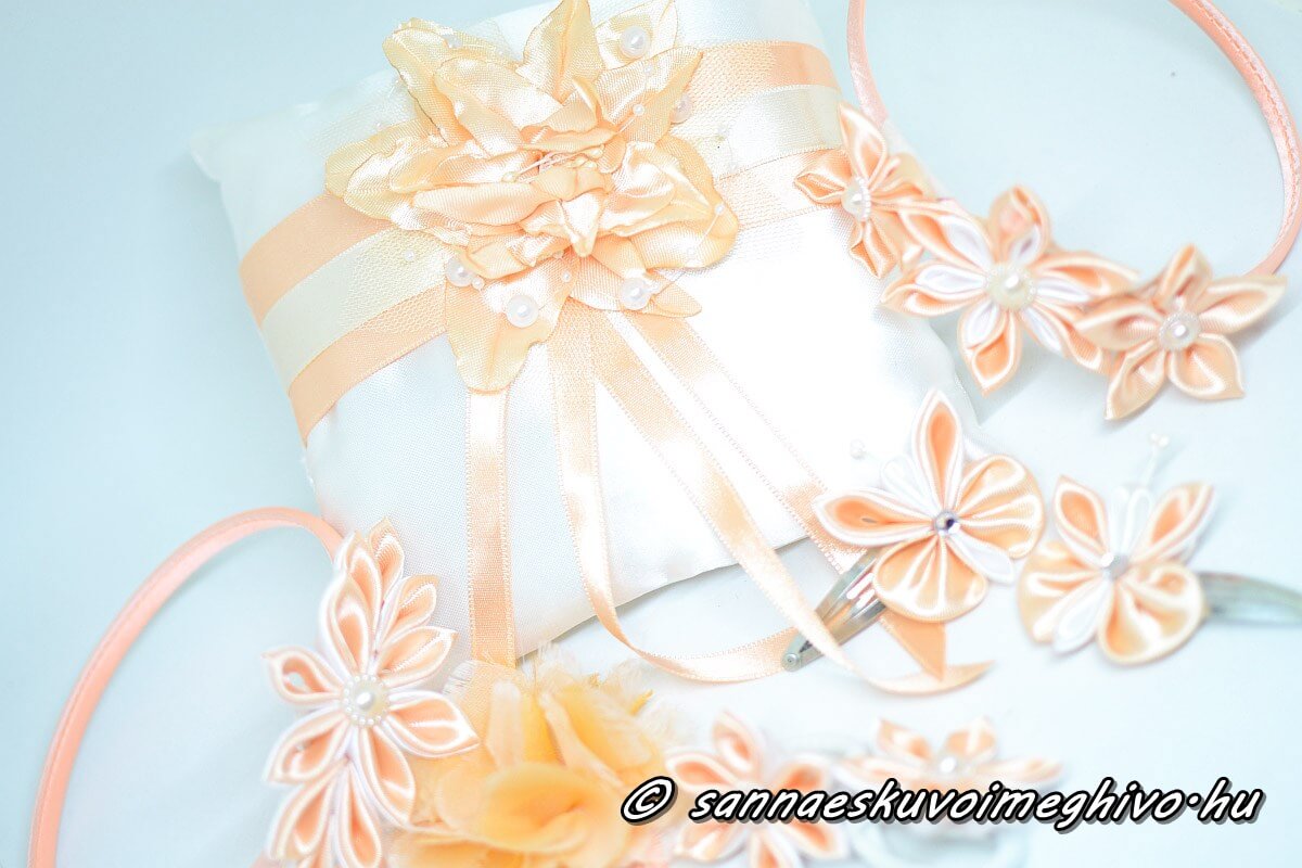 Az ár a gyűrűpárnát, a csillogót díszt, a gyöngyöket, a virágot, és a gyűrűket rögzítő vékony szalagot is tartalmazza.